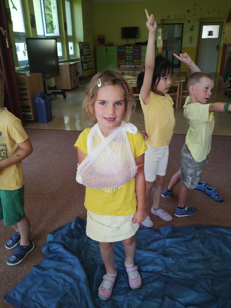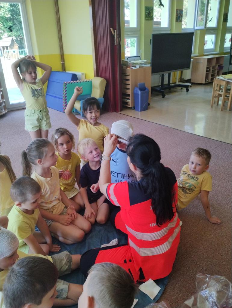Dozvěděli jsme se, jak dát správně první pomoc. Děti si mohly vyzkoušet první pomoc na medvědovi, obvázat si navzájem ruku či nohu a vyzkoušely si změřit tlak. Děti přednáška velice bavila a my moc děkujeme za poskytnuté informace a návštěvu.