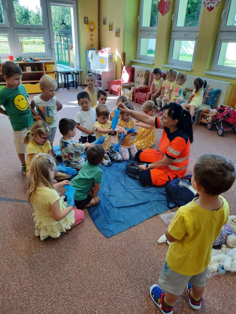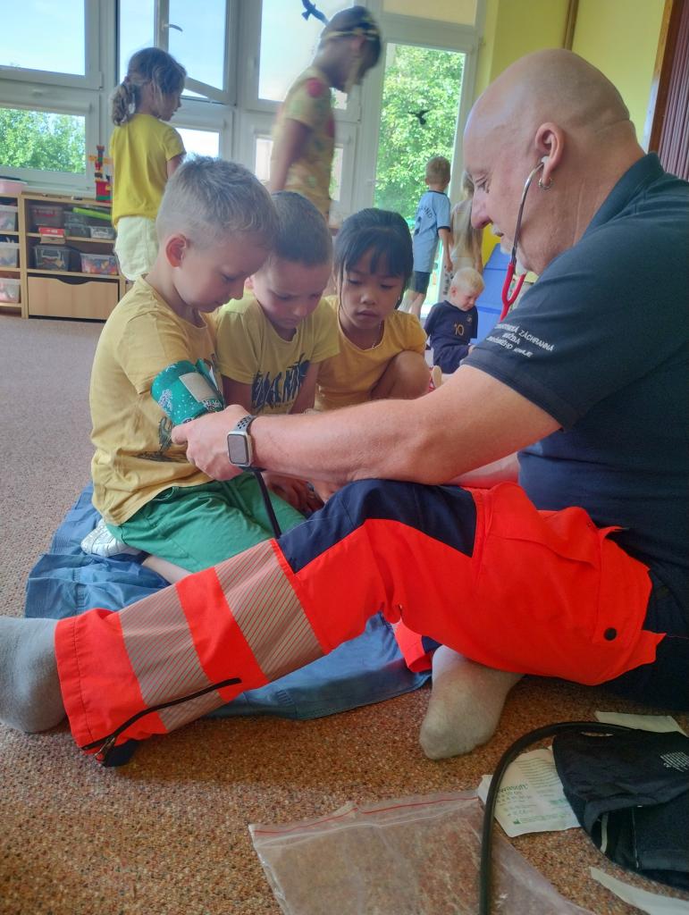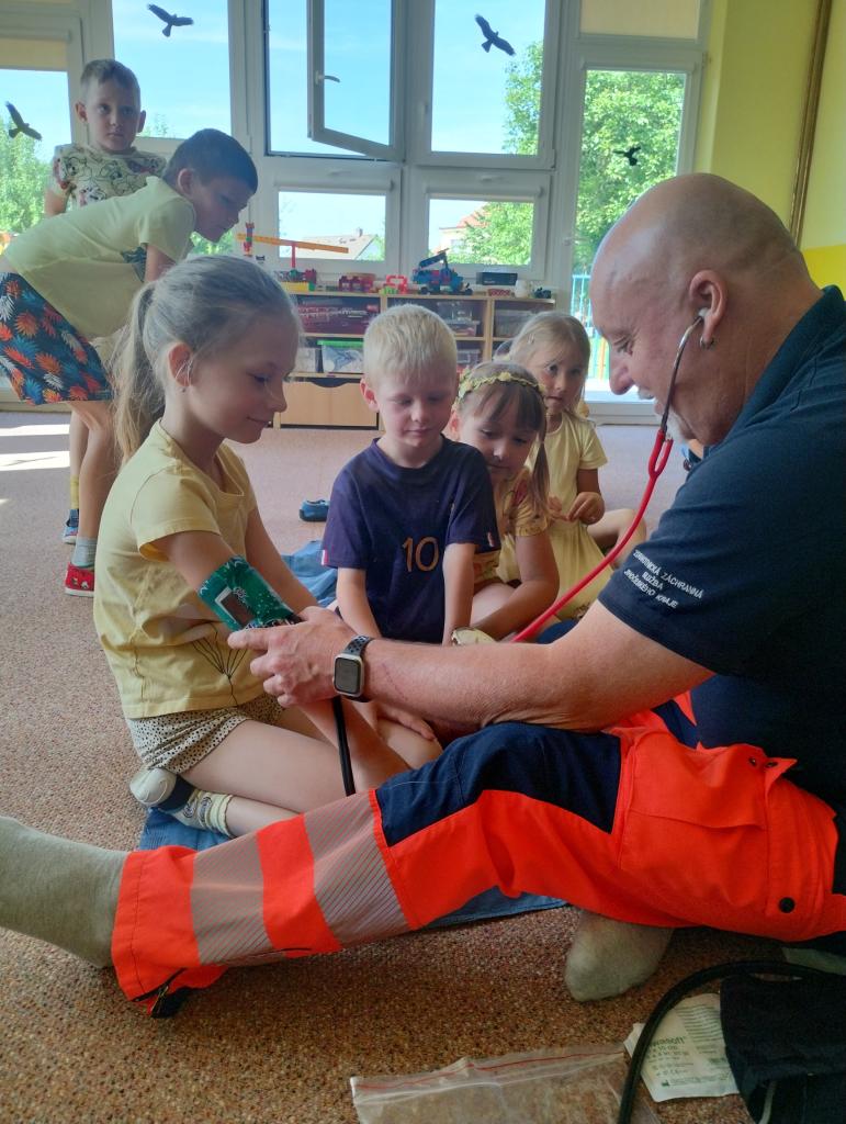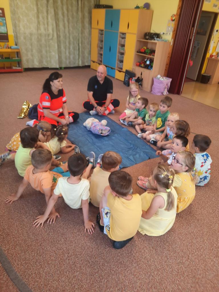 V úterý 18.6.2024 k nám do školky přijeli záchranáři z Týna nad Vltavou, zdravotní sestřička Irena Bromová a záchranář Martin Brož.