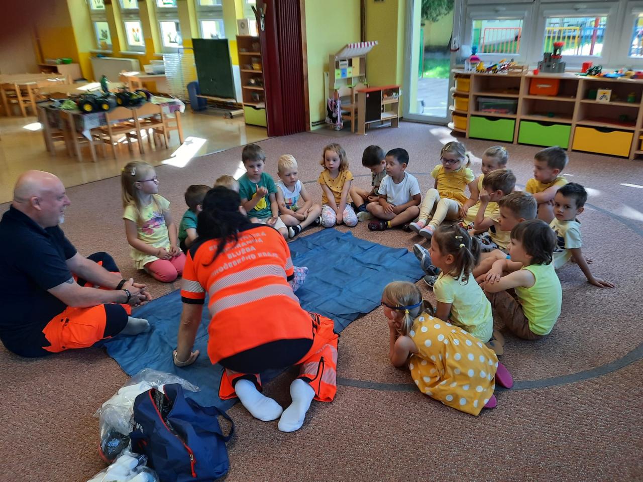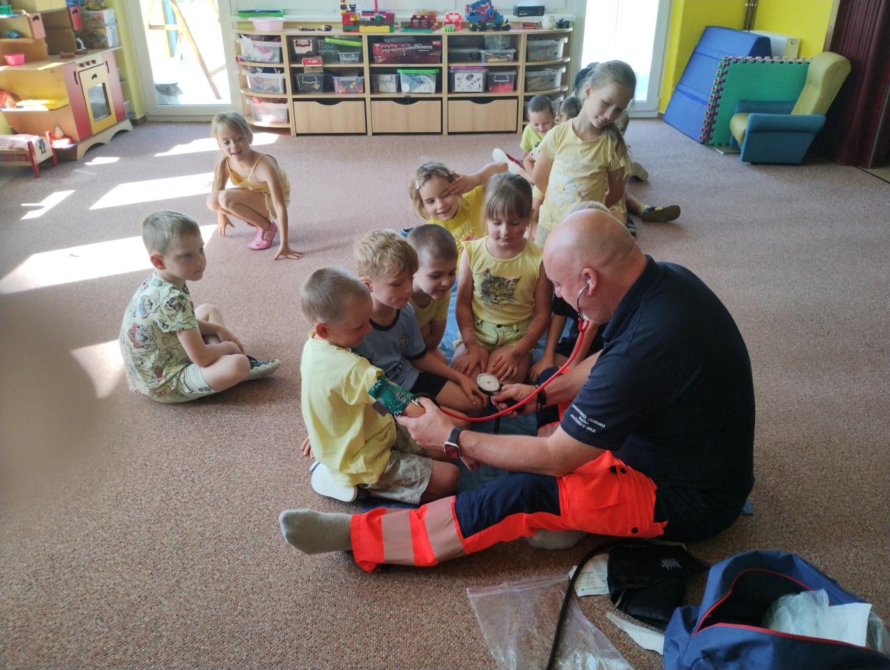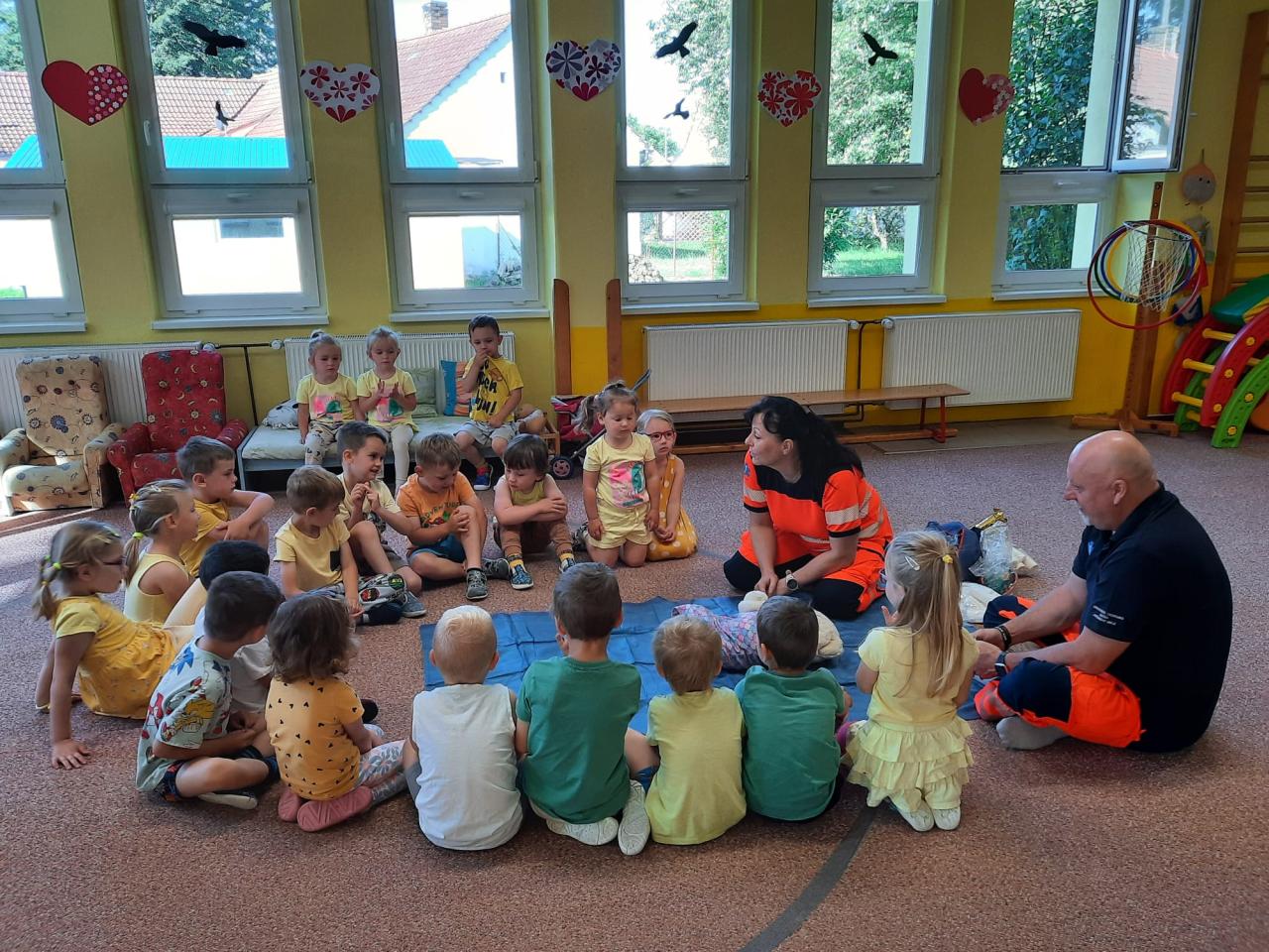 V úterý 18.6.2024 k nám do školky přijeli záchranáři z Týna nad Vltavou, zdravotní sestřička Irena Bromová a záchranář Martin Brož.