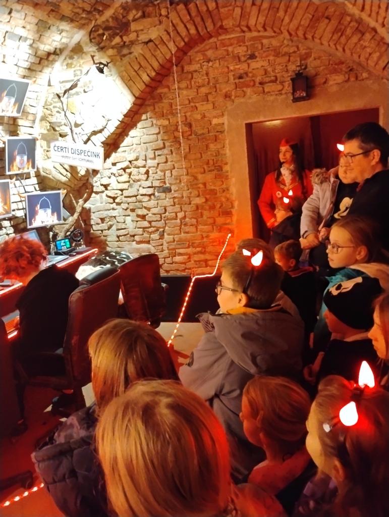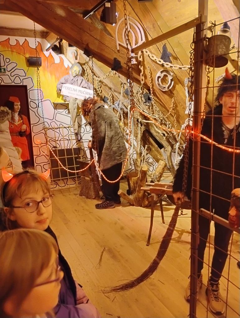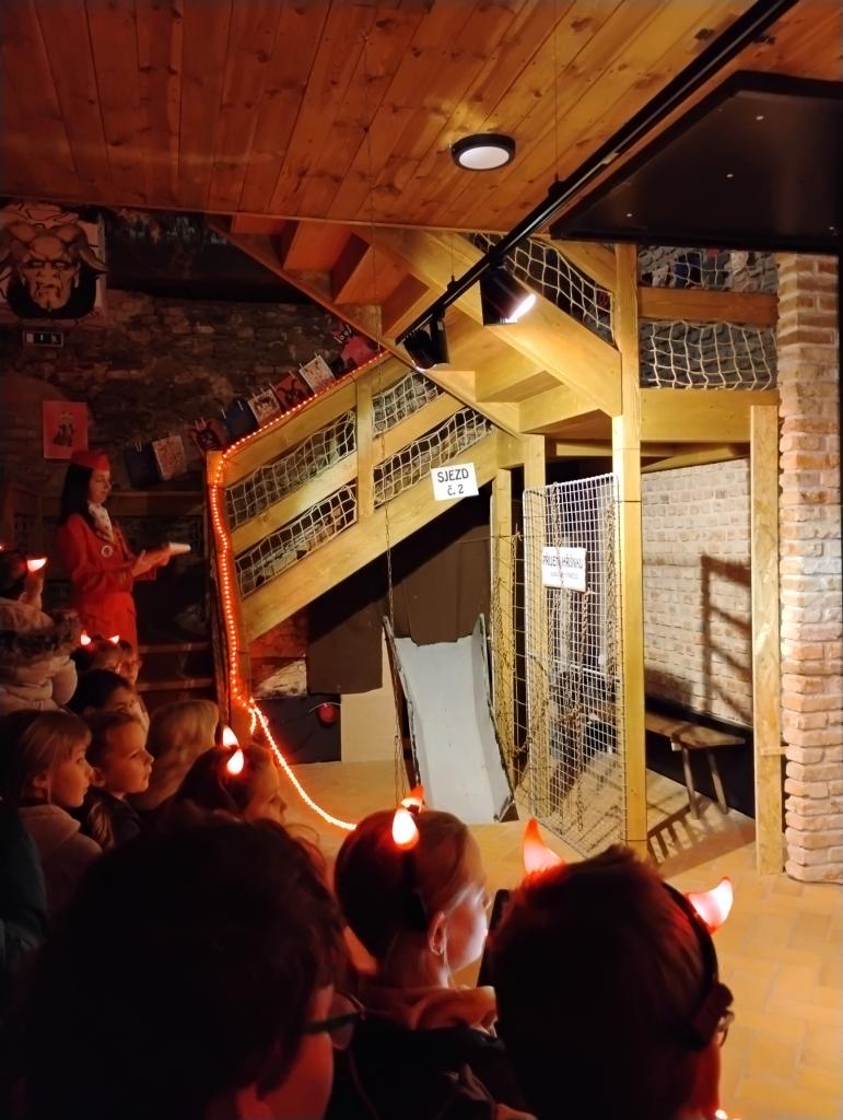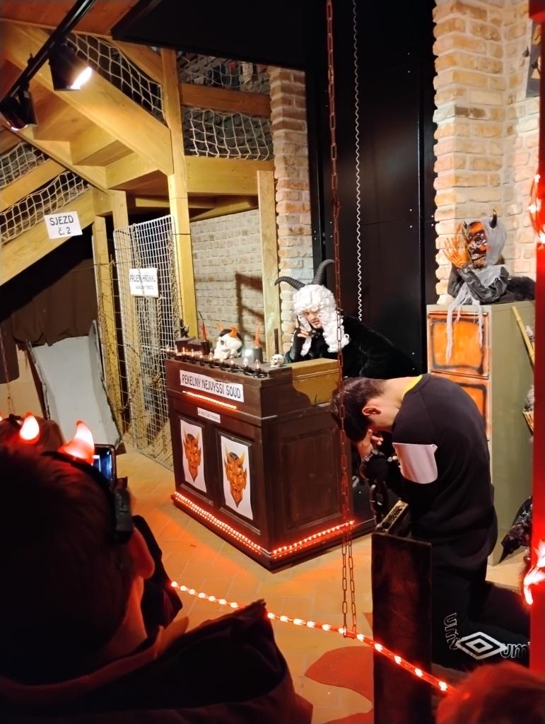 Po úvodním krátkém filmu následovala loutková pohádka. Pak se nás již ujala průvodkyně peklem. V první místnosti byl dispečink, kde čerti zaznamenali mimořádnou událost - výskyt hříšníka. Následovalo vyslání čerta pro hříšného kluka a jeho soud. Prohlídka pokračovala pekelnou školou, wellness místností pro čerty, ložnicí a pekelnou kuchyní, kde jsme byli svědky čertovské svatby. Dále pak mučírnou a návštěvou u Lucipera, kde několik odvážných dětí vstoupilo na pekelnou váhu, která nevážila hmotnost, nýbrž hříchy. Exkurze peklem končila v hospodě s tobogánem. Většina si prohlídku užila, ti co se báli, tak již méně.