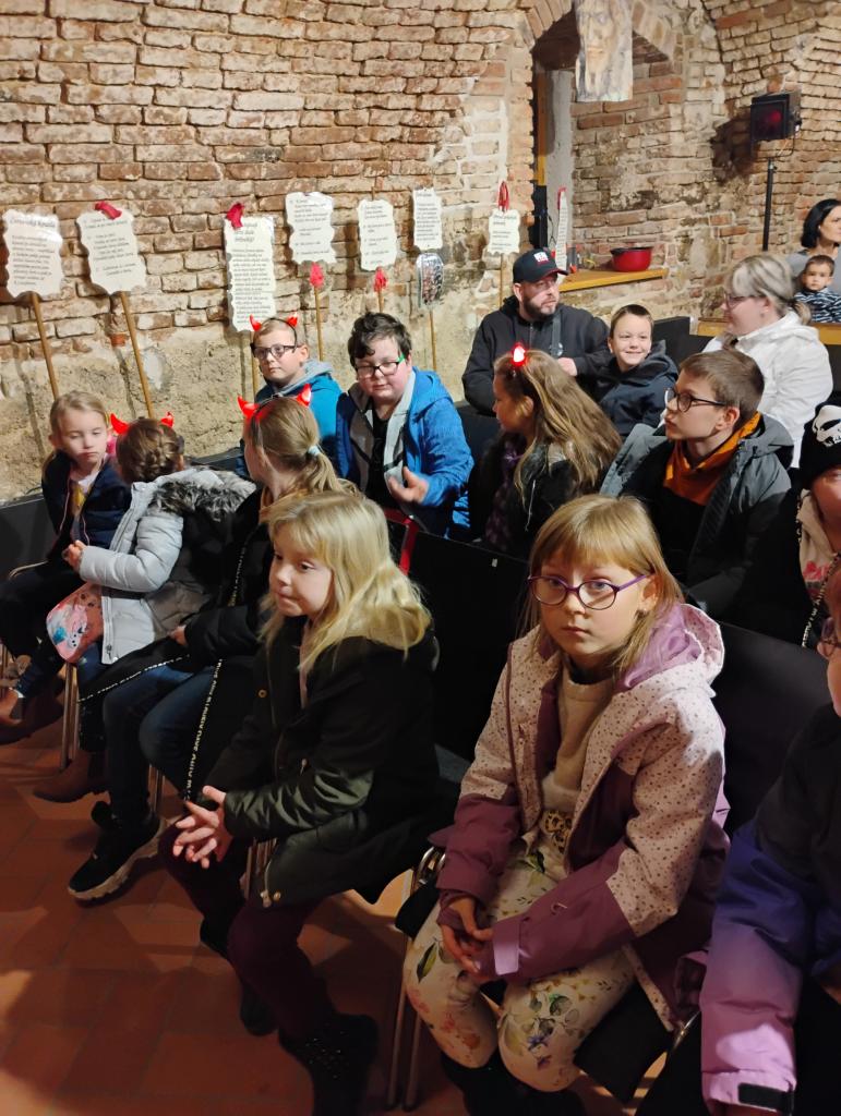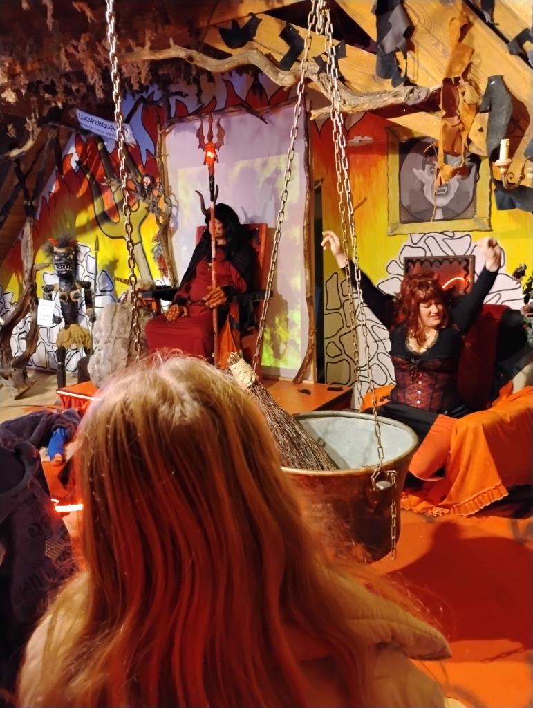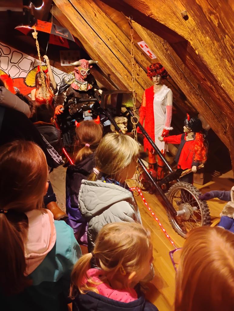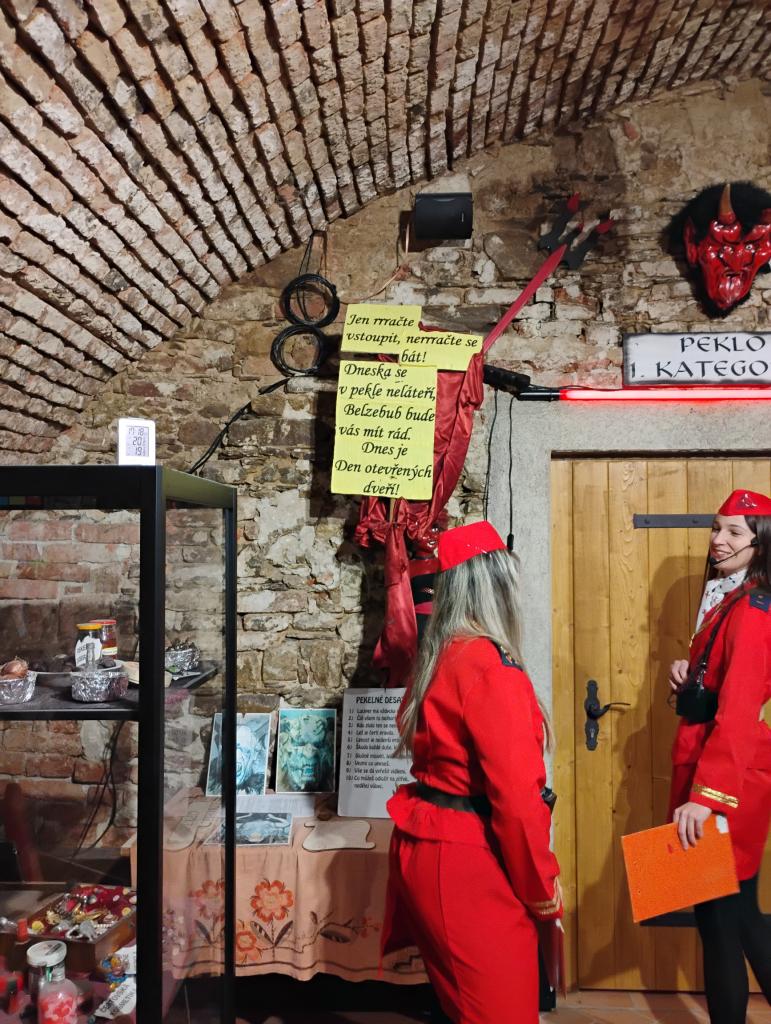 Po úvodním krátkém filmu následovala loutková pohádka. Pak se nás již ujala průvodkyně peklem. V první místnosti byl dispečink, kde čerti zaznamenali mimořádnou událost - výskyt hříšníka. Následovalo vyslání čerta pro hříšného kluka a jeho soud. Prohlídka pokračovala pekelnou školou, wellness místností pro čerty, ložnicí a pekelnou kuchyní, kde jsme byli svědky čertovské svatby. Dále pak mučírnou a návštěvou u Lucipera, kde několik odvážných dětí vstoupilo na pekelnou váhu, která nevážila hmotnost, nýbrž hříchy. Exkurze peklem končila v hospodě s tobogánem. Většina si prohlídku užila, ti co se báli, tak již méně.
