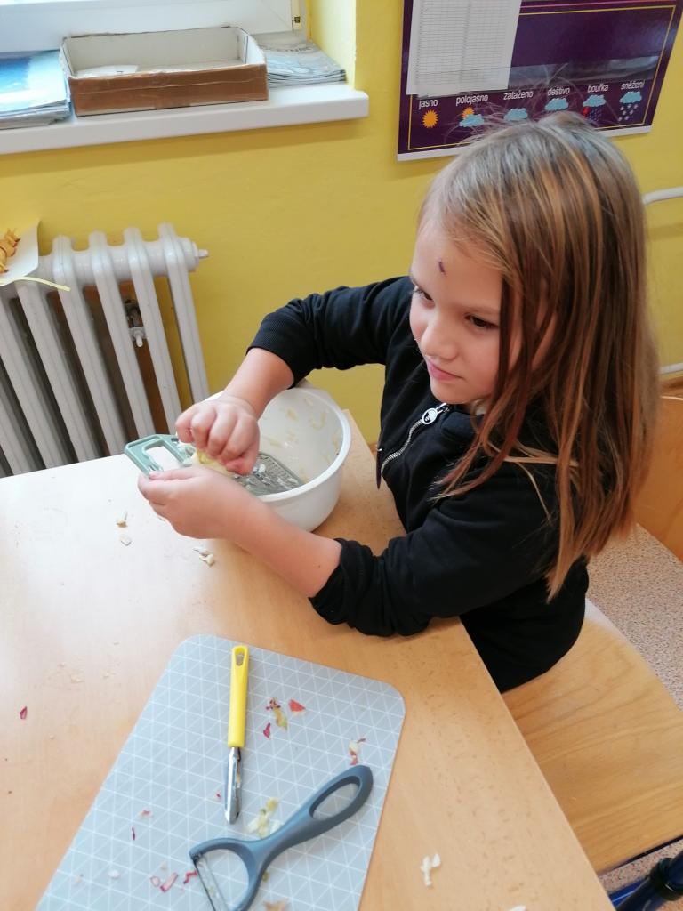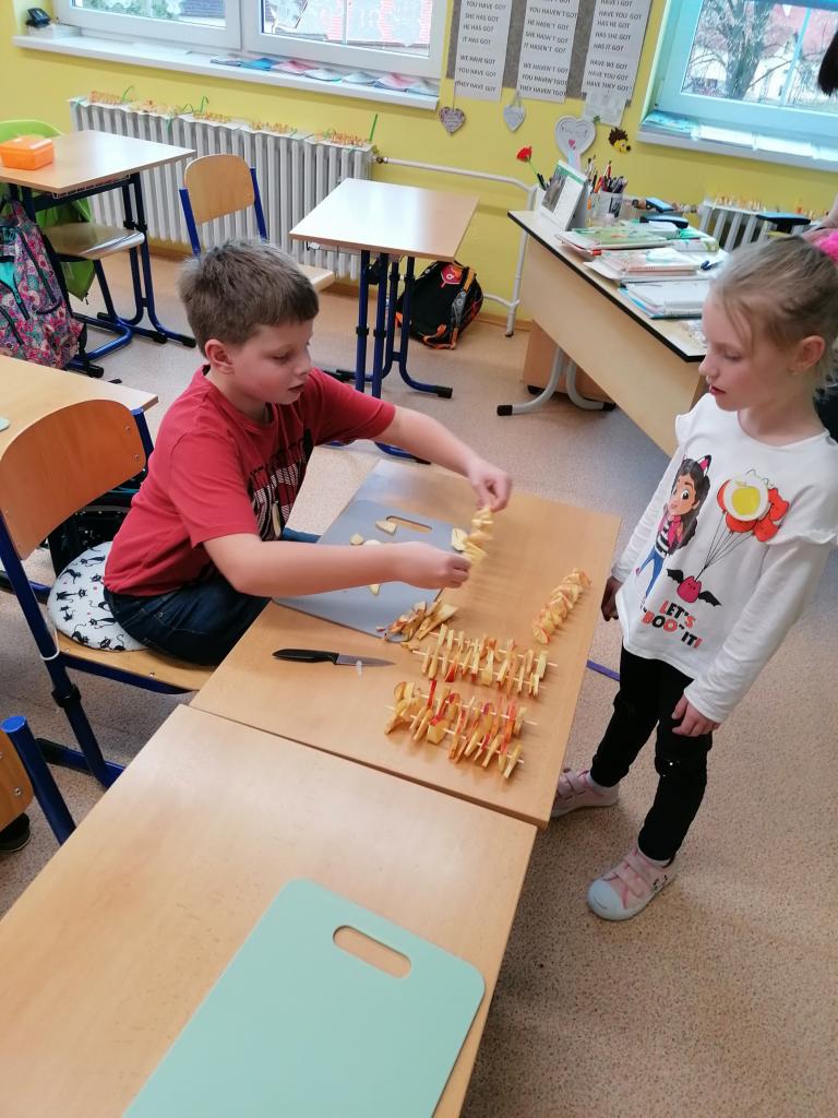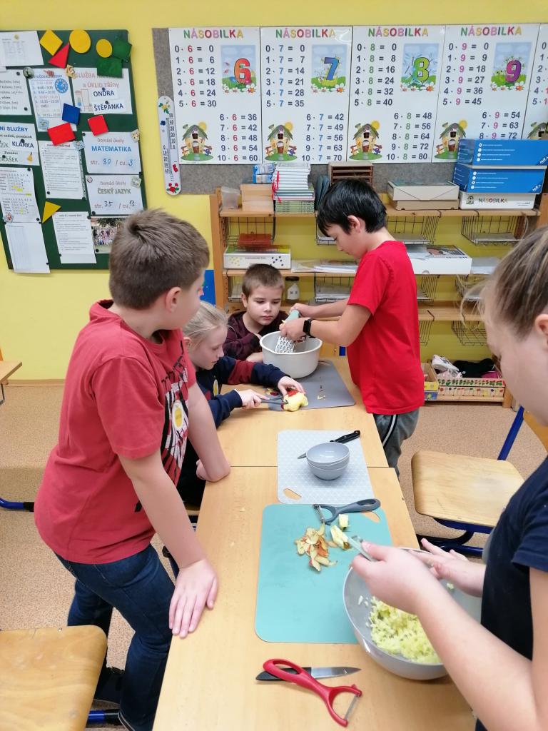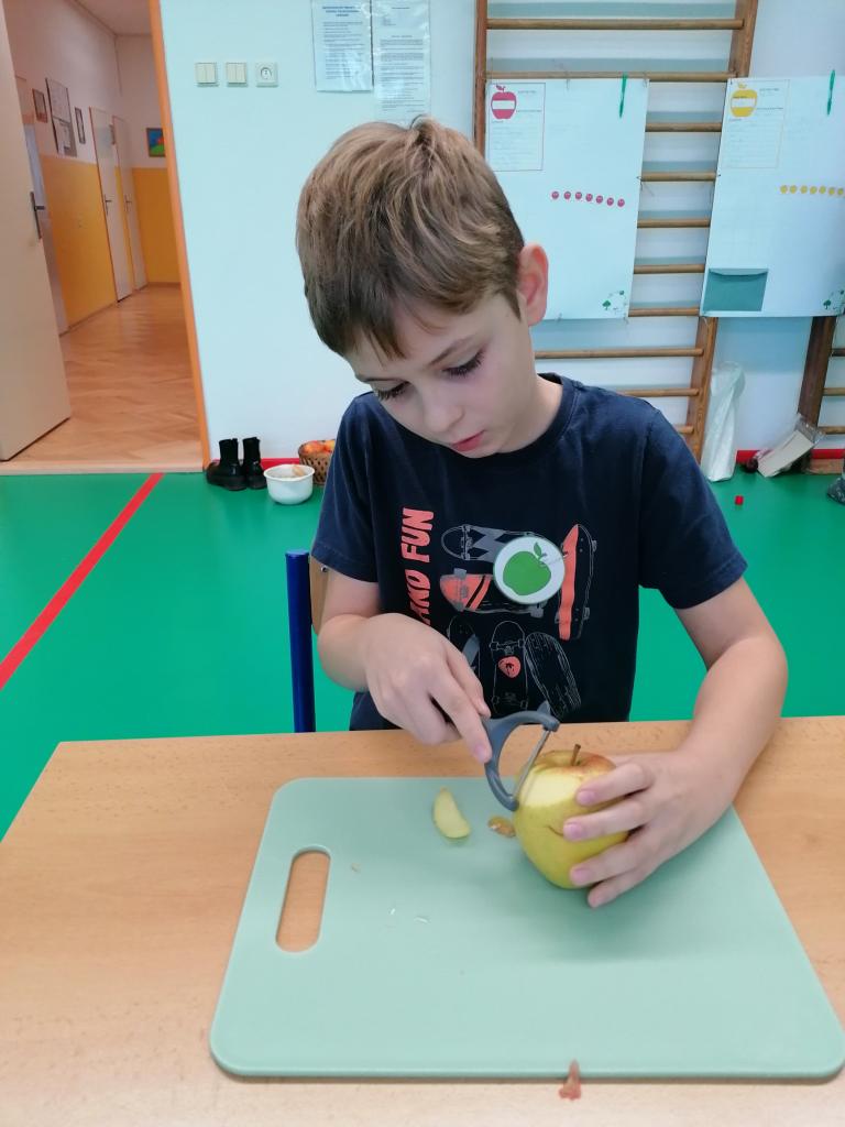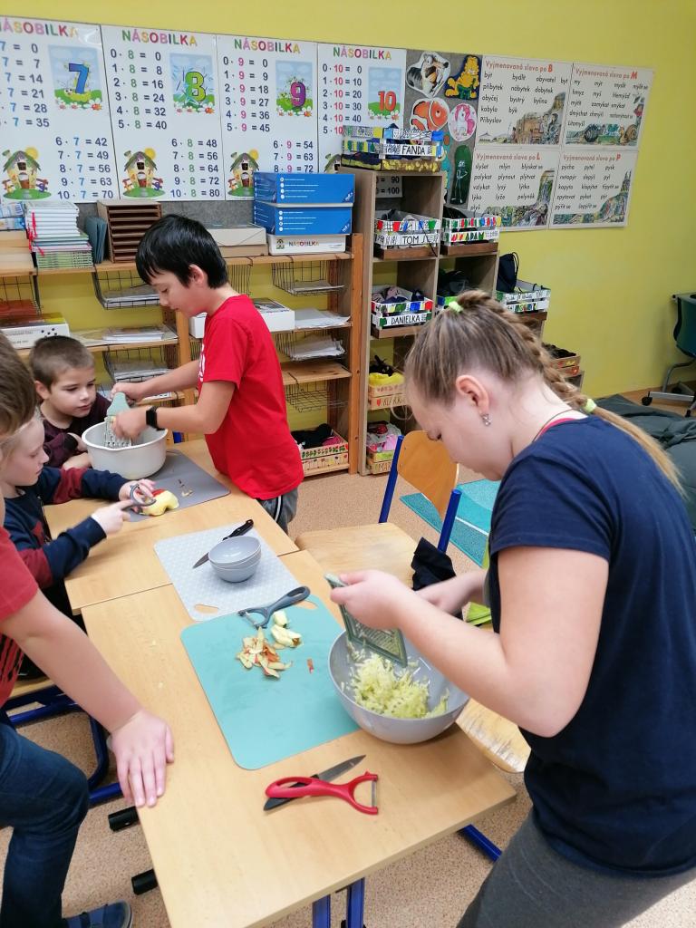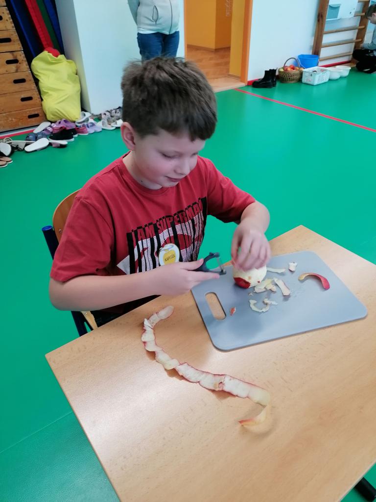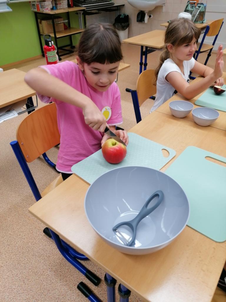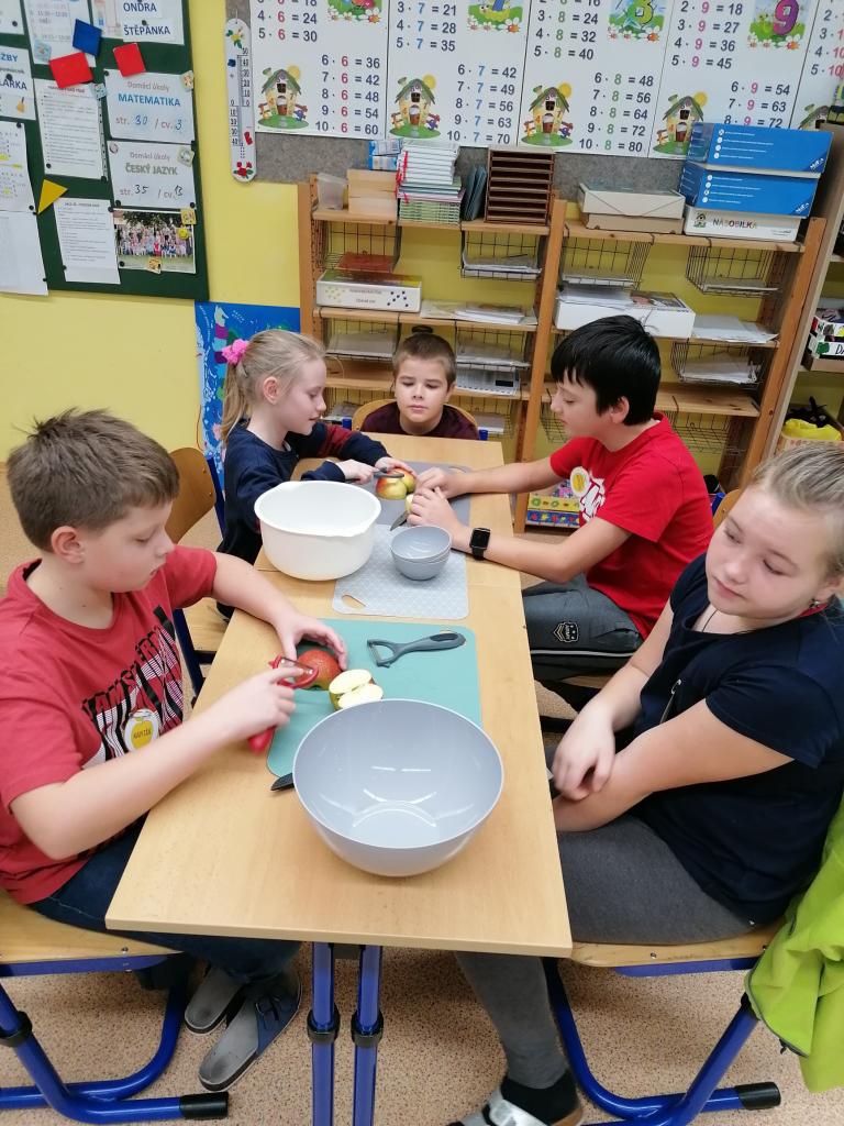 Třídenní projekt "O jablku" byl plný různorodých činností a prolínal se všemi vyučovacími předměty. Žáci byli rozděleni do třech týmů-zelené, žluté a červené jablko. Z řad páťáků měl každý tým svého kapitána a jeho zástupce. Všichni společně pak vymysleli název týmu. Své znalosti žáci uplatnili při úkolech matematických, z českého jazyka či přírodovědy. Nejen při tělocvičných disciplínách byla nutná spolupráce všech členů týmu. Projevit svou šikovnost a zručnost museli při loupání, krájení, strouhání a následném moštování, výrobě křížal či falešného štrůdlu. Kreativita měla prostor při zdobení jablek. Za každý splněný úkol dostal tým část skládačky, ze které v závěru poskládal jablko v barvě týmu. Za splnění všech úkolů získali žáci tašku plnou dobrot. Zvláštní vyhodnocení pak měl počet nasbíraných prémiových smajlíků.